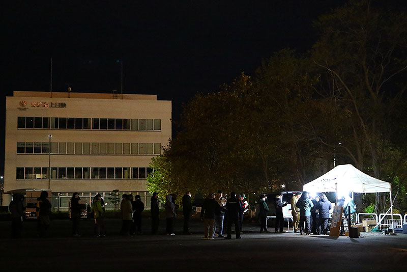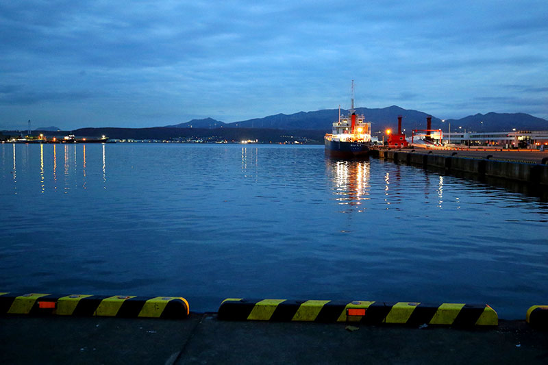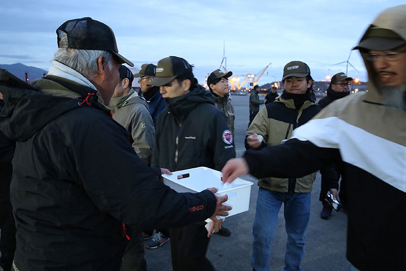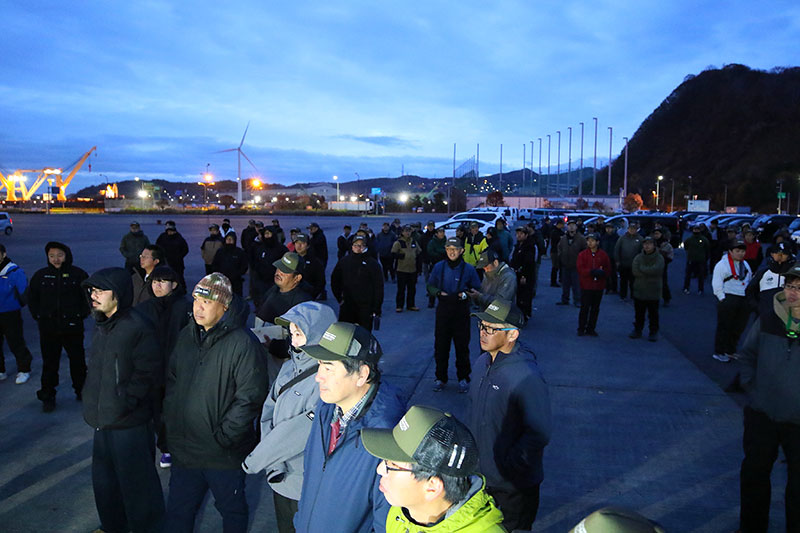 11/9、4:40。大会本部となる室蘭港フェリー埠頭に到着。気温は6℃。昨日ほどの寒さはなく、風もありません。まだ暗いなか、既に多くの選手が集まっており、早々に受付準備を済ませます。受付完了後、ミーティングを実施。そして6:00、ついにファーストフライトのコールとなります。20台ずつフライトしていき、6:15頃には全選手がフライトしていきました。当日の天気予報は曇り。潮回りは中潮。満潮が7:42(潮位129cm)、干潮が10:19(潮位98cm)というタイドスケジュール(基準:室蘭、気象庁発表)。13:00のストップフィッシングまでの競技時間中は、比較的潮が高い状況下でのゲームとなります。 |