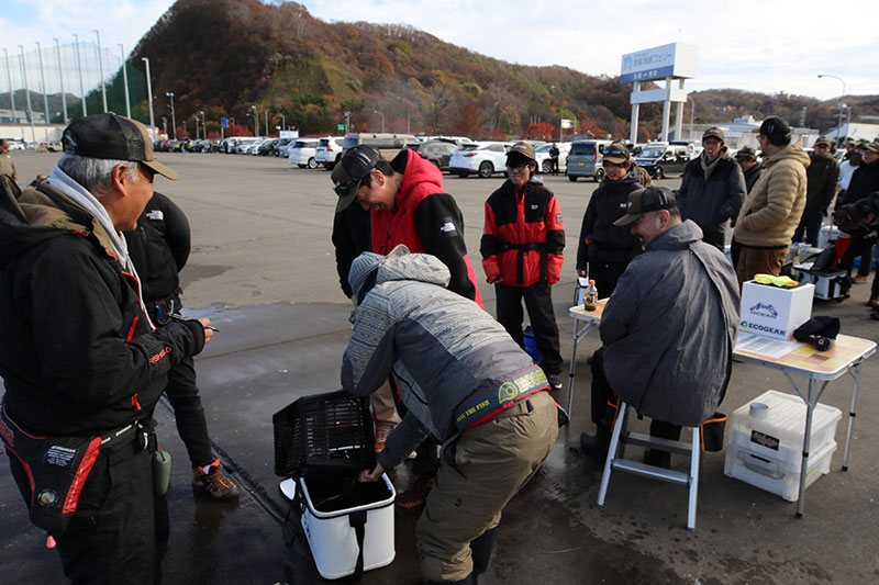 12:00過ぎ、ウエイインにポツリポツリと選手が帰ってきます。しばらくすると良型のアイナメを持ち込む選手がちらほらと出始めます。ただ、そういった選手たちに共通して見られる傾向がリミットメイクしていない点。タフコンディションのなかで競技時間内にキーパー3匹を揃えることの難しさが、検量をしているだけでもひしひしと伝わってきます。やはりローウエイト戦の様相。こうなると、キーパーぎりぎりサイズの1匹が勝敗を分けたり、順位を左右したりするシビアな展開に。それを楽しむことができるのもトーナメントならではといえます。最終的に134名中63名がウエイイン。ウエイイン率47%。ウエイトに目を向けてみると、3kgを超えた選手は1名、2kg台は5名とやはりローウエイトな結果に。はたして年間ポイントラインキングの行方はいかに… |