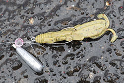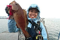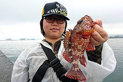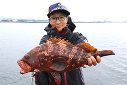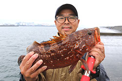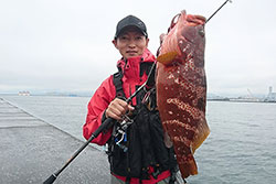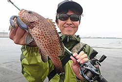 準優勝は、鹿児島県指宿市の村上達志選手。キジハタをキッカーに、オオモンハタ、カサゴのミックスバッグでリミットメイク。トータルウエイト1,700gでフィニッシュ。日頃はロックフィッシュ以外にタイラバなど様々なソルトウォーターゲームを楽しむ村上選手。まだロックフィッシュははじめて日が浅いとのことなので、ぜひこれからも九州の海でロックフィッシュゲームを楽しんでいただけたらと思います。 コメント:ノープラクティスで当日をむかえた。フライトして向ったのは、事前に釣具店の店長さんに聞いていた“北側内向き”のエリア。キジハタグラブ4”の18gフリーリグでチェックしていき、オオモンハタをキャッチした。その後、同じエリアでも外向きにシフト。スピニングタックルに持ち替えて、スプーンテールシャッドのスイミングで探っていくと、キーパーサイズのカサゴをキャッチ。あと一尾でリミットメイクといきたいところだが、その後はバイトが遠い時間が続いた。そのため、終了時刻が迫る9:30頃、エコギア熟成アクア バグアンツ3.3”(J03 青イソメ)で勝負に出た。それが功を奏し、待望のキッカーフィッシュとなるキジハタをキャッチすることに成功した!ただ、試合途中でスマートフォンを海中に落とすアクシデントがあったため少し複雑な気持ちです・・・。 タックル: