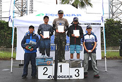 記念すべきトーナメントツアー九州、最初の表彰台頂点に立ったのは、福岡県久留米市からエントリーの古賀誠選手。昨年開催したオープントーナメント佐賀県呼子新波止から続く二連勝の快挙達成。キッカーフィッシュとなる45.5cm、1,650gのキジハタを含む、トータルウエイト1,920gでフィニッシュ。日々重ねる釣行のなかでの研鑽と“初代アングラーオブザイヤーを狙う”という強い気持ちが、第1戦優勝という最高の結果に繋がったのではないでしょうか。引き続き、九州ツアーをグイグイと牽引して欲しいと期待しています! コメント:プラクティスはゴールデンウィークに二日間かけてみっちりと行った。一日では探りきらないので、初日は外向き、二日目は内向きをチェックした。そのときは初日にキジハタ40cm弱1尾、二日目にオオモンハタ40cm弱1尾と小型オオモンハタがポロポロ程度といまひとつだった。大会当日は北側外向きに照準を絞り、足元周辺の穴撃ちにゲームを決めていた。フライト後、思ったエリアに入り、開始して20~30分後にキッカーとなるキジハタをキャッチ。ルアーは、シルエットの大きいバグアンツ4”(385 ソフトシュリンプ)をチョイス。カラーは甲殻類系パターンを想定して、385ソフトシュリンプか217イソガニの2色に絞っていた。リグは、アピール重視でブレードスピンをプラスした17.5gテキサスリグ。テンションフォールやカーブフォールで、フォールでのアピールを意識。時にクラッチを切って穴の奥までルアーを入れ込むが、大型のキジハタは奥で掛けると獲れないので、できるだけ穴の手前で食わしていく戦略。キッカーをキャッチした後は、キジハタらしきバイトはなかったが、カサゴでリミットメイクした。ウエイイン後のドキドキタイムがとても長かった。2戦目も欲張らずに3尾揃える意識で頑張りたい! タックル: