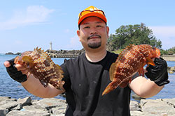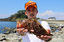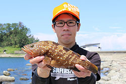 第2戦準優勝は、山形県最上郡からエントリーの鈴木崇選手。良型のキジハタ1尾を含む、キジハタ2尾をウエイインし、トータルウエイト840gでフィニッシュ。2012年開催のP.O.C.オープントーナメント庄内戦から参戦し続ける山形の雄が、見事マスターズクラシック行きのチケットを掴み取りました。 コメント: 前週の木曜日に午前中半日だけプラクティスを行ったが、海が荒れておりプランがまとまらずにいた。その時は、最初に酒田港南防波堤を探ってみるも全くダメで、温海エリアの通称“海底温泉”に移動し、消波ブロックを探ってムラソイをキャッチすることができた。大会当日もこのエリアで組み立てようと、フライト後に“海底温泉”へと向かった。フライト順が早かったこともあり、ポイント到着時は先行者なし。消波ブロックからキャスティングで探っていった。50mほどキャストし、ボトムから50cmほど浮かせたレンジをスイミングで探る。ルアーは、ロックマックス3”(468 スパークルチェリーブランデー)。シンカーは軽めが良いとの前情報を聞いていたので、14gのビフテキリグを選んだ。これで30cmクラスのキジハタをキャッチすることに成功。シンカーをさらに軽い10gに変更し、ルアーもロックマックスからエコギア熟成アクア ミルフル3.3”(J02 赤イソメ)にチェンジ。最初の魚から30分くらい後にもう一尾、キジハタをキャッチすることができた。過去にもあと一歩で表彰台を逃した経験があるので、できることならもう一尾釣りたかったがリミットメイクできなかった。マスターズクラシックに届いたことはとてもうれしい!楽しみたい! タックル: