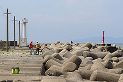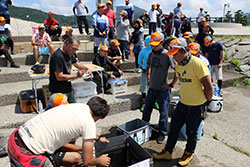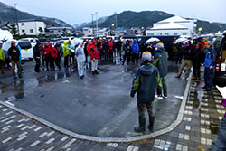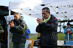 大会当日4:00前。大会本部を置く鼠ヶ関マリーナ駐車場には、すでに多くの選手が集まっています。しかし、まだ夜が明けない黒い空からは激しい雨が降り注ぐ最悪の状況。予定通り4:00より受付を開始するも、あまりの風雨に中断せざるをえない状況に・・・。一時は開催が危ぶまれましたが、徐々に落ち着く予報が出ているため、受付、タックルチェックを行いつつ、天候の回復を待ちます。予定より少し時間をおした4:50、雨が弱まったタイミングでレギュレーション、エリア確認のミーティングを実施。そして、東北ツアー恒例の尾形和尚による爆釣・安全祈願を行い、5:10、遂に東北ツアー第2戦のフライトとなりました。フライトNo.ごとに北へ、南へと選手が散っていきます。 |