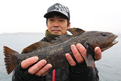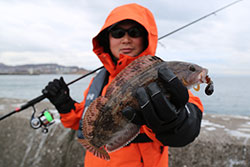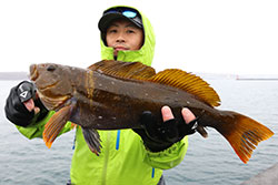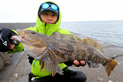 アイナメ3尾、3,570g スタート後、堤防中央部の南面壁際を攻め始める。ハードベイト等を入れ、探っていくがチェイスのみ。ルアーをミノーSのジグヘッドリグにチェンジ。魚の反応を見ながら、バイトを引き出すパターンを煮詰めていく。フォールを効果的に織り交ぜることでバイトが増えることに気がついてからは怒涛のラッシュ。リミットメイク、入れ替えをし、スコアを伸ばしていった。 |