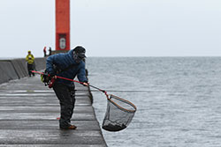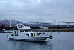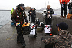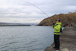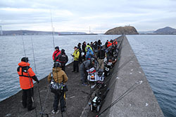 一夜明け、いよいよ決戦当日。6:15、ホテルを出発し、渡船および本部となる道の駅みたら室蘭へと向かいます。見上げればどんよりとした鉛色の空が広がります。午後に向けて、雨が降り出すあいにくの天気。南風が徐々に吹き始めるとの予報でした。各選手、タックルセッティングを終え6:50頃、いざ決戦の地・南外防波堤へと渡ります。全選手が沖堤防に到着後、タイムスケジュールを再度確認し、予定時刻から10分ほど遅れて7:10、いよいよパワーオーシャンカップ スーパーロックフィッシュ2019のスタートフィッシングとなります。合図とともに11名の選手がそれぞれの描くプランをもとに散っていきます。