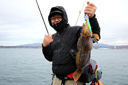 アイナメ3尾、2,940g スタート後、西側へと展開。北面でミドルディスタンスのゲームを開始するも、エゾメバルに翻弄される。ゲームをガラッと変えるため、西端の南側に移動。そこから一気にリミットメイク、入れ替えをすることができた。 |