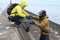 11:00過ぎ、再び試合が動き始めます。菅原選手、能登選手、山崎選手が立て続けにナイスフィッシュをキャッチ。11:25には玉川選手も入れ替えに成功します。11:30、再び能登選手がナイスフィッシュをキャッチし、入れ替え。折本選手も入れ替えを繰り返しています。各選手の状況をヒアリングし驚いたのが、この段階で全11名の選手がリミットメイクに成功しており、さらに全員が40cmクラス以上で揃えているということ。ロックフィッシュの聖地・室蘭沖堤防とはいえ、過去振り返ってみても類を見ないハイウエイトな接戦に。はたして誰がこのハイウエイト戦を抜け出すのか? |