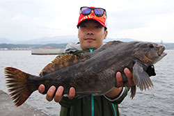 準優勝には、千歳市からエントリーの田辺陵真選手。コンディション抜群のアイナメ1,790gをウエイイン。今シーズン、北海道ツアーにも参戦している田辺選手。周囲のアングラー達と切磋琢磨し、めきめきと実力をつけてきている若手アングラーの一人です。この流れで勢いに乗り、ツアー戦の表彰台も狙ってほしいと思います。 コメント:プラクティス無しで今大会に臨んだ。ツアー戦とは違い、ワンフィッシュ勝負なので気持ち的にはプレッシャーが少なく、いつもとは違ったことを試してみようという思いで沖堤防に上がった。まず、ショットオーバー3で壁際をトレース。しかし、日頃からやりこんだスタイルではないため、早めに見切りをつけた。次に結んだのはフラチャット。巻きの展開をするも掴み切れず。そこで、ケーソンの切れ目にフォールさせると30cmクラスのシマゾイをキャッチ。気持ちを切り替えて、いつもの遠投スタイルに戻すことに。ステージ外向きを遠投で探る。ロッドストロークでズル引きして探るもスタックが頻発。そこで内向きにスイッチする。ちょうどトイレ船のタイミングで3位の黒丸選手がアイナメをランディングしている姿を見たので集中して探った。狙い目は、沖の砂地フラットから手前の基礎に差し掛かるショルダー部。ここをあえて派手に動かさず、なるべく丁寧にゆっくり抜いてくる感じで探る。派手に動かすと口を使わない感じだったため。すると、大型のアイナメ特有のコツッとしたバイト!それがウエイインフィッシュとなるキッカーアイナメだった。ルアーは、スイッチオントレーラー(098 ライトグリーンパンプキンフロート)の28gフリーリグ。リミットメイクのプレッシャーが無く、気持ちを楽にして終始楽しむことができた! タックル: