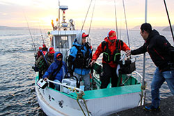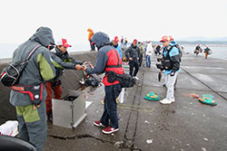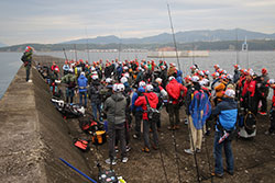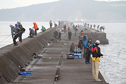 沖堤防上の検量本部場所は、渡船場所となる南寄りのステージ上。スタート後の各選手の配置を見てみると、検量本部から南端は内向き、外向きともに満遍なく選手が立っています。過去実績の高い南端は予想通り、人気ポイントに。回ってくればビッグフィッシュ。回ってこなければノーフィッシュ。そんなギャンブルなポイント選択がこの南端の特徴。超大型の回遊タイプははたして回ってくるのか?朝の段階ではその兆しは見えません。南端ではなくその手前のエリア、実はここも過去大会において実績があるエリアです。南端の派手さに隠れがちですが、検量本部のあるステージ周辺も含め、沖でも手前でも大型が出る可能性が十分にあり、北防波堤攻略においては外せないポイントの一つです。もちろん、選手もそのことは重々承知。多くの選手がロッドを振っています。各選手が、沖のフラット、手前の基礎周りを丁寧に探っています。北へさらに足を延ばしていくと、堤防の中央より北側は意外に選手の姿がまばら。しかし、このエリアに展開している選手の顔ぶれを見ると、錚々たるメンバーです。プラクティスで好調だった「壁×ハードベイト」パターンを中心に壁際を攻め続けています。話を聞いてみると、良いサイズのアイナメがチェイスはしてくるけどあと一歩のところでバイトに持ち込めない・・・バイトに持ち込んでもキスバイトでミス・・・。プラクティスの時とはどうも勝手が違う様子。はたして、この状況が大会時間中に好転するのか?やはり「壁×ハードベイト」パターンが勝負の鍵を握っていそうです。北端まで来ると、数名の選手がエントリーしています。検量本部からここまで歩くにはかなりの時間を要します。移動の時間を押してでもこのポイントを選ぶだけの理由がそこにあるはず。カレント絡みの大型回遊個体に照準を絞り、そのコンタクトを待つ選手達。ワンバイトで良い!一尾で良い!感覚を研ぎ澄ませて探り続けています。 時折、空から雨が落ち、追い打ちをかけるように東風が体温を奪うなか、各選手が“勝利を掴み取る一尾”をまっすぐに追い続けます。全体を見渡した釣況は、基礎周りを攻めている選手が1,000~1,500gのアイナメをポツポツとキャッチしています。朝早い段階で一名、50cmクラスをキャッチしたとの情報がある程度で、大型個体はなかなか顔を見せてくれていません。超大型を期待したい沖の回遊個体は600~800gと中型中心。通常のツアー戦なら、この魚でリミットメイクと考えますが、今回は一本勝負。上位に食い込むためには最低でも1,500gは超えておきたいところです。本命視されていた壁際の魚を追う選手達はというと、ハードベイト、ソフトベイトともに大型個体のチェイスやバイトは確認できるものの、フックアップまで至らないもどかしい状況が相変わらず続いている様子。どの展開もワンバイトをものにすることが勝利に繋がる可能性があるだけに、各選手の集中は途切れません。 9:00頃、膠着状態だった試合が少しずつ動き始めます。トイレ船が検量本部前につくこのタイミング、これがワンチャンスをもたらすことを知っている一部の選手達。船のスクリューが大きく水を動かすことで、ステージ周辺にコンタクトしてくる沖の回遊個体のスイッチが一時的に入ることを期待してロッドを振っています。そのなかで2名の選手がバイトをモノにします。ネットに納まったのはどちらも1,800gに迫るナイスフィッシュ。この魚が勝利へと導くのか?2kgクラスが出る室蘭沖堤防だけに、12:00の最終帰着まで気が抜けません。 |