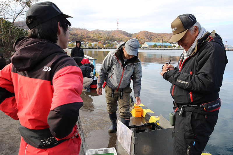 12:00過ぎ、ウエイインにポツリポツリと選手が帰ってきます。しばらくすると良型のアイナメを持ち込む選手がちらほらと出始めます。ただ、そういった選手たちに共通して見られる傾向がリミットメイクしていない点。タフコンディションのなかで競技時間内にキーパー3匹を揃えることの難しさが、検量をしているだけでもひしひしと伝わってきます。やはりローウエイト戦の様相。こうなると、キーパーぎりぎりサイズの1匹が勝敗を分けたり、順位を左右したりするシビアな展開に。それを楽しむことができるのもトーナメントならではといえます。最終的に134名中63名がウエイイン。ウエイイン率47%。ウエイトに目を向けてみると、3kgを超えた選手は1名、2kg台は5名とやはりローウエイトな結果に。はたして年間ポイントラインキングの行方はいかに… |