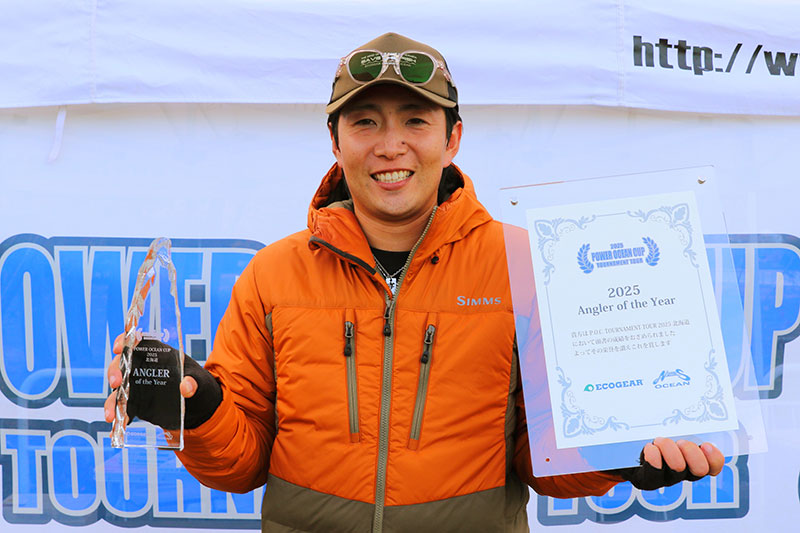 第1戦7位、第2戦1位、第3戦64位で年間累計ポイント218pt.を獲得し、P.O.C.2025トーナメントツアー北海道の頂点に立ったのは上野孝勇貴選手。第2戦の優勝で年間ポイントランキング1位に躍り出たものの、最終戦はまさかのノーフィッシュ。しかし、同様に2戦目までの年間ポイント上位者達も軒並みポイントを積み上げられず、稀にみる混戦に。2戦目までのリードを保ち、悲願のA.O.Y.を掴み取りました。おめでとうございます! |